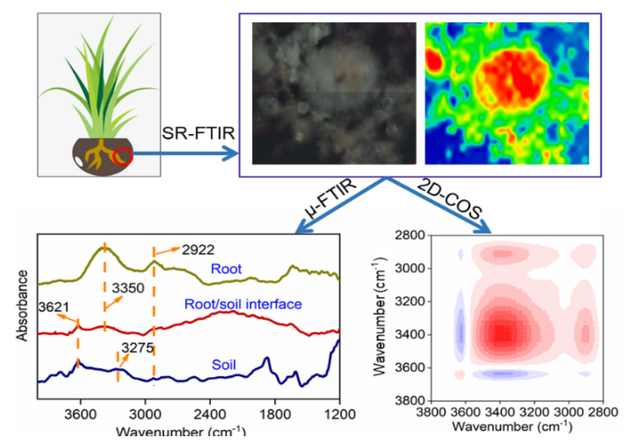 基于SR-FTIR和二维相关光谱相结合的方法,探索两种植物根际中根/土壤界面有机碳的化学成分和官能团的变化,为根际有机碳浓度、分布和动力学微尺度水平过程研究提供了新方法。