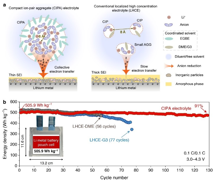 ),被视为下一代高比能电池的主要技术路线,但目前存在的主要挑战是循环寿命较短,限制了其实际应用。中国科学技术大学联合北京大学、中科院物理所和苏州大学的研究人员通过调控电解液在介观尺度下的锂离子溶剂化结构,设计了一种紧密离子对聚集体(CIPA)电解液,采用高镍正极材料设计了能量密度为505.9 Wh kg