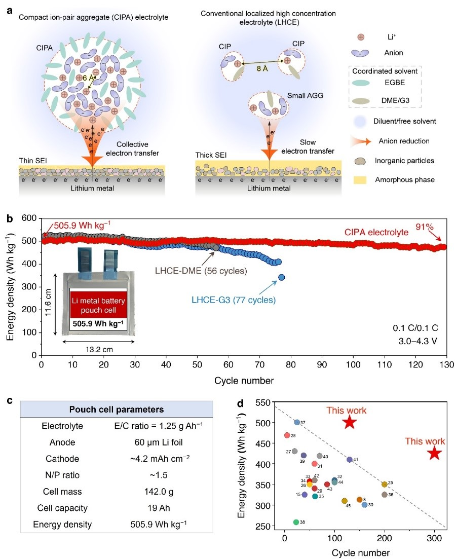 锂金属电池具有极高的理论能量密度(> 500 Wh kg−1),被视为下一代高比能电池的主要技术路线,但目前存在的主要挑战是循环寿命较短,限制了其实际应用。中国科学技术大学联合北京大学、中科院物理所和苏州大学的研究人员通过调控电解液在介观尺度下的锂离子溶剂化结构,设计了一种紧密离子对聚集体(CIPA)电解液,采用高镍正极材料设计了能量密度为505.9 Wh kg−1 的锂金属软包电池,并实现了130次(约2750小时)稳定循环。利用高能X射线和对分布函数(PDF)方法,确认了这种电解液的短程结构特征。