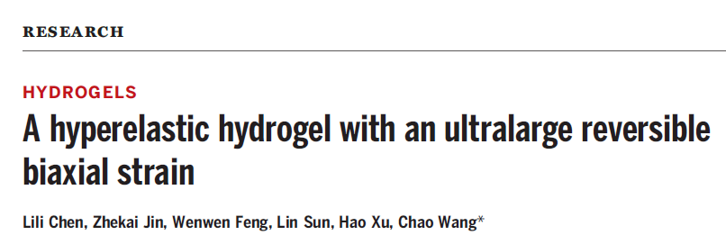 水凝胶的聚合物网络模型一般遵循幻影网络模型或滑环网络模型,其最大单轴弹性应变λmax与交联点之间的链段数目N的1/2次方成正比。此外,双轴变形下聚合物链条沿两个方向伸展,无论共价交联网络或非固定的滑环交联网络的双轴可拉伸性都会大大降低,因此进一步实现优异的可逆双轴变形则面临着更大的挑战,目前报道的水凝胶的可逆双轴面应变不超过2,500%。清华大学王朝副教授课题组在水凝胶中首次引入了全新的串珠网络,这种可逆串珠网络的λmax接近与N的2/3次方成正比,通过可逆地释放与回缩大量的链段数目,实现了可逆双轴面应变高达10,000%的超弹性水凝胶。这项工作以“A hyperelastic hydrogel with an ultralarge reversible biaxial strain”为题在Science上发表。