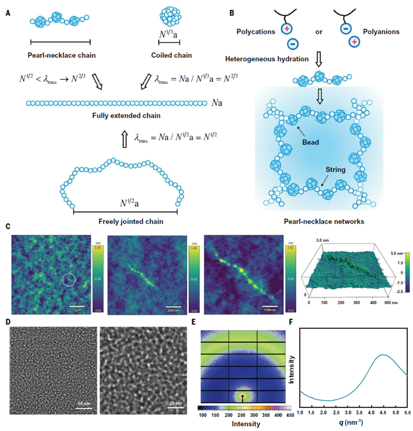 聚电解质既有疏水基团又有带电基团。带电基团之间的静电斥力迫使聚合物链延伸, 疏水基团之间的疏水作用导致聚合物链塌缩。疏水和静电相互作用的竞争和平衡导致了串珠链的形成。然而在过去,串珠链被认为只存在于稀溶液。作者选取了具有强亲水性离子基团和弱疏水性且柔性的烷基链的聚电解质,在少水环境中首次得到了具有串珠网络的水凝胶材料。作者通过上海同步辐射BL16B SAXS测试表征了水凝胶的静态结构,首次证明了水凝胶中串珠结构的存在,测得了珠子之间的平均间距大概分布在1.14 to 2.09 nm。