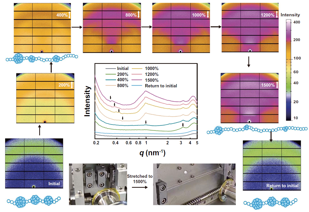 作者又进一步使用上海同步辐射BL16B光源原位观测了水凝胶在拉伸过程中的变化。未变形的水凝胶在二维SAXS图像中只能观察到一个圆形的散射环,在1D SAXS曲线中只能观察到一个宽峰,对应着相邻亚纳米珠子之间的初始距离(1.37 nm)。随着水凝胶的拉伸,在低q区出现了新的散射环和新的散射峰(箭头位置所示),并且这些新峰的比例逐渐增加。这是因为随着拉伸倍数的增加,更多的聚合物链从珠子中拉伸出来,导致珠子之间的距离扩大了。在较低的应变(200%)下,最初随机取向的串珠链逐渐沿着施加力的方向排列,只有少数聚合物链从珠子中被拉出。因此,珠子之间的距离变化不大,导致计算应变(42%)偏离施加应变(200%)。在更大的拉伸下,大量的聚合物链被拉出珠子,从而减少了计算应变与施加应变的偏差。当材料从1500%的单轴应变下释放,回复后的水凝胶的SAXS数据与未变形的水凝胶非常相似,证明了串珠构象在1,500%的应变释放后可以完全回复。