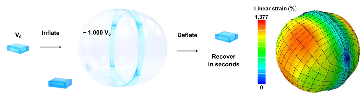 基于这种可逆的串珠结构,作者最终得到可逆双轴面应变高达10,000%的水凝胶材料。材料被双轴拉伸到10,000%倍的面应变后仍然可以快速完全回复。水凝胶气动装置在充入相对于原始空腔体积100,000%倍的空气后,在放气后可以几秒内就可以快速回复到初始状态。