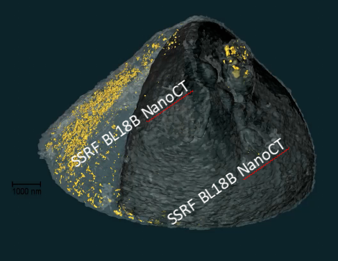 月壤FIB切割样品的纳米三维CT实验,重构后可区分样品中的玻璃体,铁基体及氦泡。