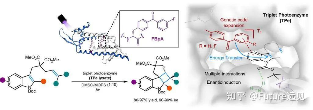 这项工作是酶催化光化学领域的关键性突破。研究者将三线态能量转移这一典型的光催化模式整合到蛋白质中,通过基因重新编程,将功能改性的非天然氨基酸插入蛋白质,创造出含有三线态光敏剂的人工光酶,成功催化吲哚衍生物的分子内[2+2]光激发环加成反应,并且可以实现利用人工光酶与底物分子立体化学的非共价键相互作用控制[2+2]光激发环加成反应过程中的对映体选择性,实现高达99%e.e对映体选择性。