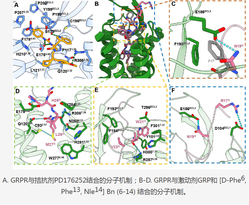 胃泌素释放肽受体(GRPR)是G蛋白偶联受体中蛙皮素受体家族的成员之一,其广泛分布于中枢神经系统和外周组织中,对生理和病理过程具有广泛的影响。其中,GRPR在多种癌症中异常过表达,包括乳腺、前列腺、胰腺、肺和中枢神经系统,在肿瘤的诊断与治疗中具有重要的应用价值。PD176252是第一个GRPR高亲和力非肽类拮抗剂,能以低毒性的剂量依赖性方式抑制小鼠肺癌细胞的生长和增殖。此外,GRPR由背根神经节(DRG)神经元中的GRP激活,主要介导非组胺能瘙痒的传递,是脊髓和三叉神经感觉神经元中负责非组胺能瘙痒传递的主要受体。临床研究表明,大多数慢性瘙痒是抗组胺药难以解决的,目前缺乏安全有效的治疗药物。因此,解析GRPR与拮抗剂和激动剂复合物的三维结构,将有助于基于结构研发新型GRPR靶向药物用于治疗癌症和慢性瘙痒。