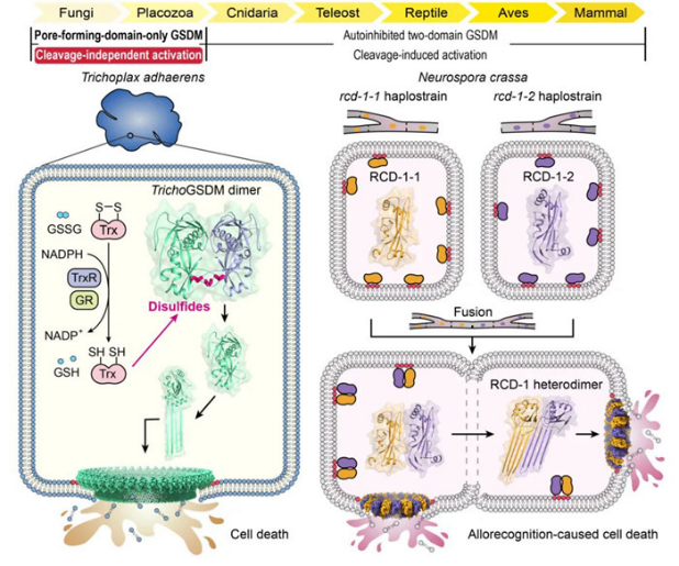 揭示了低等真核生物中两类只含有膜打孔结构域的GSDM蛋白,分别通过氧化还原调控或配对的分子间相互作用来释放膜打孔活性的全新激活机制,拓展了对GSDM蛋白进化和功能多样性的机制理解。