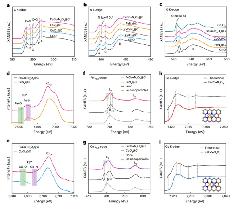 双原子催化剂(DSAs)具有高活性和原子利用率等优势,在可持续能源转换和存储技术方面具有广阔前景;然而,合理设计和合成具有结构均匀和灵活位点的双原子催化剂仍是一项挑战。用户团队成功合成了一种具有Fe-Co位点的碳基催化剂,表现出优异的双功能活性。该催化剂中的Fe原子和Co原子分别与N原子和O原子配位,并通过桥接N原子和O原子连接。VtC-XES清晰地指认了Fe-O、Fe-N/Co-O、Co-N的配位和轨道杂化(图1d及图1e),从而确定了FeCo-N3O3@C四元二聚体催化剂的结构。Nature Synthesis 2024, 3, 878–890