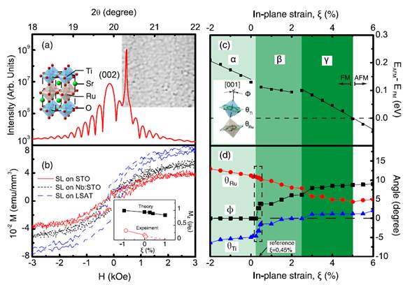 由于Ru系钙钛矿的结构、电子和磁属性可以被系统地设计,所以是目前国际上研究的热点问题。SrRuO3具有奇异的铁磁属性,SrTiO3具有超导、表面/界面二维电子气等属性,SrRuO3/SrTiO3 超晶格对应变非常的敏感。南京大学吴小山教授课题组根据第一原理计算得出,该材料在高张应变区域由铁磁金属转变为反铁磁性绝缘体,并伴随清楚的倾斜八面体;而在低应变区域时,它是一种强磁性金属,没有倾斜八面体存在。