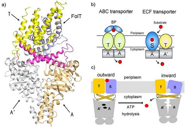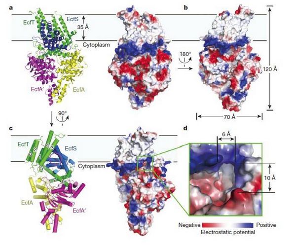 能量耦合转运蛋白是一类近年来新鉴定的转运蛋白,广泛存在于革兰氏阳性病原菌之中,负责摄入一些维生素及其他微量元素。该转运蛋白复合物包含4个组分:两个结合并水解ATP提供能量的亲水蛋白(EcfA和EcfA′),一个识别和转运底物的膜蛋白(EcfS)和另一个传递能量的膜蛋白(EcfT)。