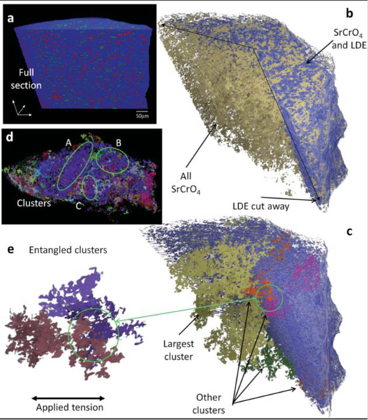 图1: 嵌套分形集群. (a) 截面图, 铬酸锶用红色表示, 正常密度环氧树脂基体用蓝色表示, 低密度环氧树脂基体(LDE)用绿色表示; (b) 低密度环氧树脂基体和铬酸锶颗粒聚集群的三维显示; (c) 低密度环氧树脂基体及5个最大的铬酸锶聚集群的三维显示;(d) 不同铬酸锶颗粒聚集群用不同颜色显示,蓝色表示最大的群体; (e) 互相嵌套纠缠的铬酸锶簇集群, 系统的剪切性能会因此而改进