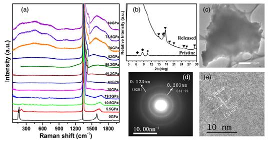 (a)不同压力下C70豆荚的拉曼光谱;(b)C70豆荚在常压和68Gpa泄压后的衍射谱变化;
