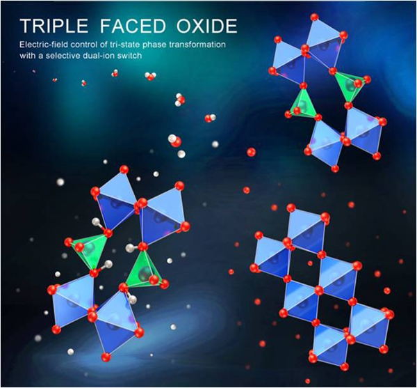 电场控制离子导致的结构相变在物理及材料科学中具有重要意义,并被广泛应用于电池、智能玻璃、燃料电池等应用领域。然而到目前为止,这些调控只依赖于O2- ,H+ 和Li+等单离子的调控,而基于选择性双离子(如O2-和H+的电场控制相变尚未实现。通过构思和优化设计,于浦所带领的研究团队采用离子液体电场调控的方法,在模型体系氧化物SrCoO2.5结构中首次实现了电场下的双离子(O2-离子和H+离子)的可逆调控,并伴随着SrCoO2.5与SrCoO3-δ以及以前尚未发现的新相SrCoO2.5之间的三相可逆结构相变(如图1)。值得指出的是,传统上研究人员通常借助外加压力或者材料生长过程的化学掺杂等调控手段实现新型物相及新颖物性的设计。而该工作中的电场控制下的离子插入和析出及其所对应的物相转变,为材料的物性调控提供了一类全新的手段。该项发现可以被广泛推广到其它一系列材料体系中,从而孕育出大量的新奇结构相变和丰富功能特性。