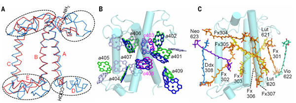 图3:FCP和LHCII结构对比。A:Lhcf4和Lhcb1的二级结构差异;B: FCP结合的叶绿素a(绿色)和叶绿素c(洋红色),LHCII中的叶绿素a/b分别用蓝色和银色显示。C:类胡萝卜素结合位点对比。硅甲藻黄素:Ddx;叶黄素:Lut;紫黄质:Vio;新黄质:Neo。