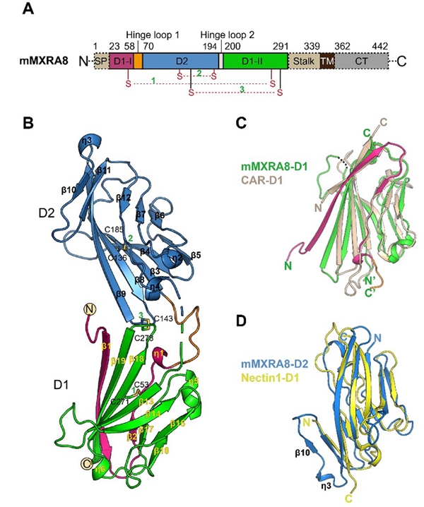 高福研究团队深入研究了MXRA8分子介导CHIKV的入侵机制。首先,他们利用上海光源生物大分子晶体学线站(BL17U1)解析了小鼠MXRA8(mMXRA8)的晶体结构,表明MXRA8分子胞外段由两个免疫球蛋白(Ig)样结构域构成,但其两个Ig样结构域呈现独特的拓扑结构。结构域1(D1)由两个不连续的片段构成,而结构域2(D2)插在了D1的两个片段之间,这导致D1和D2之间有两个柔性铰链(Hinge loop)连接,这与以往所有报道的含有两个Ig样结构域的蛋白都不同。因此,他们首次提出MXRA8是一种新型的Ig样受体分子,并具有独特的拓扑结构及结构域间组装形式。