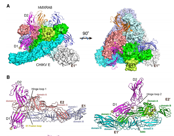 2019年5月9日,中科院微生物研究所高福院士团队和中科院天津工业生物技术研究所高峰团队在Cell杂志上发表了题为Molecular Basis of Arthritogenic Alphavirus Receptor MXRA8 Binding to Chikungunya Virus Envelope Protein的文章,首次从分子水平阐释了基孔肯雅病毒囊膜表面E蛋白与其细胞受体MXRA8分子的相互作用机制,揭示了此类病毒入侵细胞的分子机制,为抗病毒药物开发及新型疫苗设计提供了新靶点。