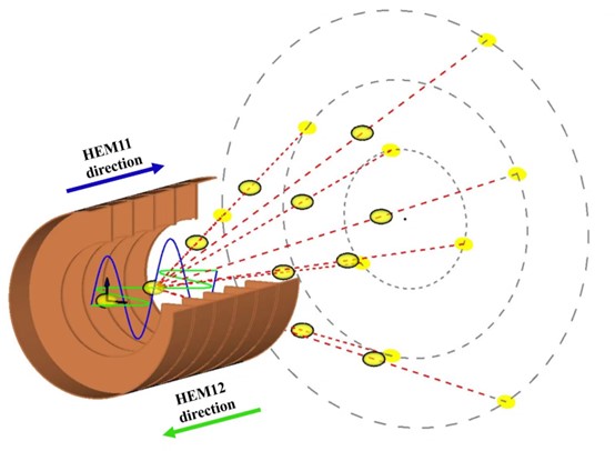 新型的偏转腔由双模常规腔、双模耦合器和低通滤波结构组成。在偏转腔内同时激发极化方向正交、传输方向相向的两个行波偏转模式——HEM11和HEM12。在三维电磁场模拟设计中,两个正交模式合成后,偏转电磁场相位的传播速度与束团飞行速度同步,使束团感受到稳定的横向偏转力,并通过调节两个正交模式的幅度和相位配比,改变横向偏转力的极化方向和强度,进而实现束团偏转方向在立体角度可调的功能。相比较于传统单一模式的偏转腔结构,双模偏转腔结构复杂,优化目标繁多,因此技术团队还基于神经网络和多目标优化算法开发了高效的优化算法,成功完成了15-cell双模偏转腔验证样机的物理设计和工程设计。目前,该样机已完成加工和测量,即将开展高功率测试和束流实验,预计偏转梯度均可以达到30MV/m。