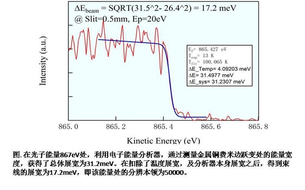 2014年10月28日,在由中科院组织的工艺测试中,超高分辨率宽能段光电子实验系统(“梦之线”,BL09U)项目顺利通过技术测试,全面达到验收指标。其中,作为关键指标的光束线的能量分辨本领,一举突破50000,此分辨率下的光子通量亦达到1.2E10 phs/s。此前,瑞士光源ARDRES光束线拥有世界最高的软X射线分辨能力,相同能量下的分辨本领为33000。
