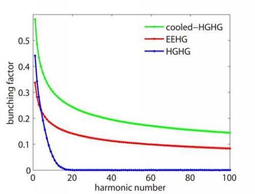Cooled-HGHG与两种传统外种子自由电子激光谐波转换效率比较:Cooled-HGHG谐波转换效率大约是EEHG2倍,而远远大于HGHG