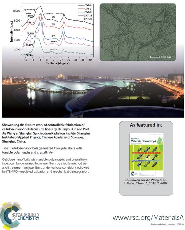 近期,上海应用物理研究所生命科学部X射线散射组科研人员开展了基于黄麻纤维的纤维素纳米纤维可控制备及其宏观组装的研究工作。研究人员利用上海光源同步辐射X射线小角散射、广角等表征手段,系统研究了黄麻纤维在预处理过程中纤维素晶型及结晶结构的微观变化以及预处理过程对制备纤维素纳米纤维的影响规律,并通过冷冻干燥法将纤维素纳米纤维组装成具有三维多级结构的超轻气凝胶材料;通过研究,简化并优化了黄麻纤维的纤维素纳米纤维制备过程,提高了制备效率和产率,为纤维素纳米纤维的规模化制备奠定了基础。相关工作发表在Carbohydrate Polymers(2014, 109, 35-43)和Journal of Materials Chemistry A(2014, 2, 6402-6411)上,其中发表在Journal of Materials Chemistry A关于纤维素纳米纤维晶型和结晶度调控方法的研究工作被选为Back Cover。(生命科学部 供稿)