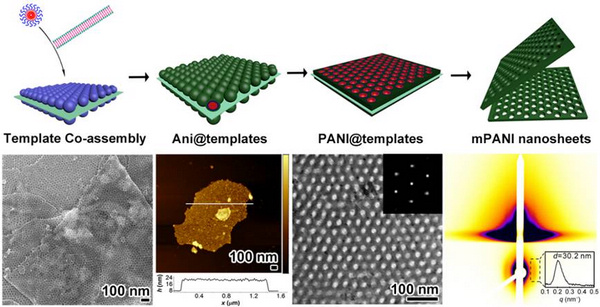 上图描述了合成二维有序介观结构聚苯胺的过程,下图为扫描电镜、原子力显微镜、透射电镜以及小角X射线表征结果,证明了该材料的二维有序介观结构。