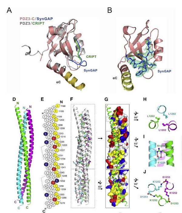 图:PSD-95 PDZ3-C/SynGAP PBM复合物晶体结构和SynGAP coiled-coil 三聚体晶体结构