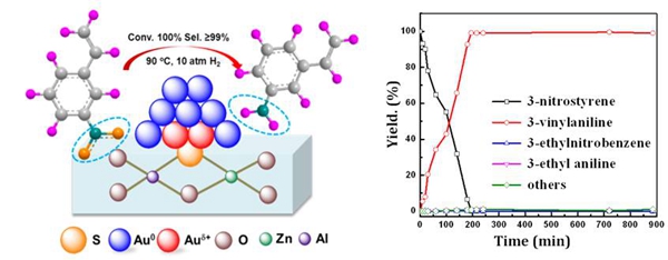 芳胺是合成各种医药、农药、染料、聚合物以及精细化学品的重要中间体,其主要来源是芳香硝基化合物选择加氢。当底物中含有其它不饱和基团时,只还原反应物分子中的硝基而保留其它易还原基团是一个巨大的挑战。张涛院士课题组曾经采用FeOx负载的Pt催化剂,通过准确控制反应温度和时间,实现了该过程。XAFS表征结果显示,该催化剂中以Pt为中心的近邻原子除了O和Fe原子之外,还有较远的Pt原子(Pt-Pt距离为2.99 Å大于Pt foil的Pt-Pt间距2.76 Å),可能存在Pt-O-Pt的结构。基于此,在“单原子”的基础上,提出了“准单原子”的概念、。但是,对于铂族金属催化剂,因为硝基和其它不饱和基团之间存在竞争吸附关系,随着反应底物中硝基浓度降低,仍难以避免其它不饱和基团的加氢。近十年以来,张涛院士课题组在金催化研究方面有很好的积累,金催化剂因其对反应物和产物的吸附较弱,在很多反应中表现出较高的选择性。然而将传统的金催化剂应用于该反应体系时,在底物完全转化的条件下,目标产物中的其它不饱和基团还是会不可避免地进一步加氢。