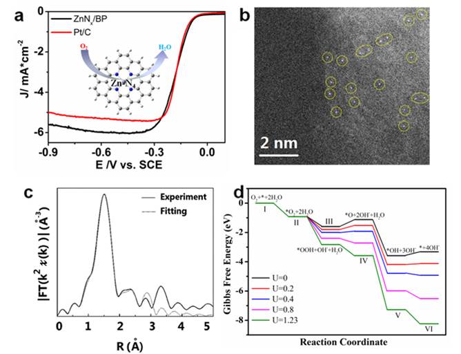 该团队与中科院上海应用物理所姜政课题组以及中科院物理所谷林课题组合作,利用廉价的炭黑和锌前驱体,简易地制备了廉价的单原子锌基氧还原电催化剂,该催化剂展现出和商业碳载铂相媲美的氧还原性能,并具有很好的稳定性。高角环形暗场扫描隧道显微镜(HAADF-STEM)证实该锌基催化剂中的锌主要是以单原子锌存在,而扩展的X-射线吸收近边谱(EXAFS)证实单原子锌的主要存在方式为Zn-N4。进一步的理论计算表明该单原子锌催化剂的高催化活性主要来源于Zn-N4结构。反应机理研究发现Zn-N4位点上O原子中间体的吸附是该反应的决速步骤 (图1)。