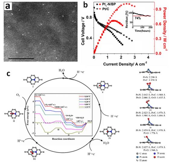 图2. 单原子Pt基氧还原电催化剂的形貌、电池性能以及机理预测