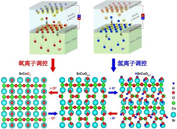 图1:通过氧离子和氢离子的电场调控,可以实现SrCoO3, SrCoO2.5和HSrCoO2.5之间的可逆相变。