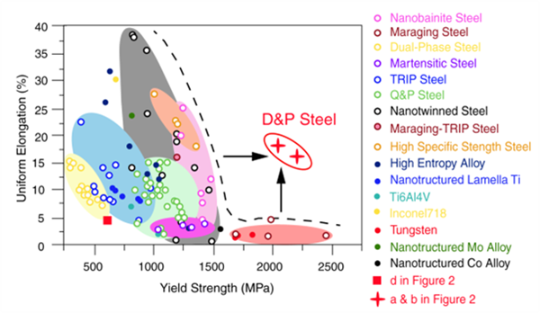 近日,香港大学机械工程系黄明欣教授课题组与北京科技大学罗海文教授团队成功研制了一种低成本便于规模化生产的超级钢(D&P 钢),该超级钢具有前所未有的最优屈服强度(2.2GPa)和延展率(16%)的结合,实现了力学性能上的巨大跃升,该成果发表在《科学》杂志上(Science357, 1029–1032 (2017))题为“High dislocation density–induced large ductility indeformed and partitioned steels”。