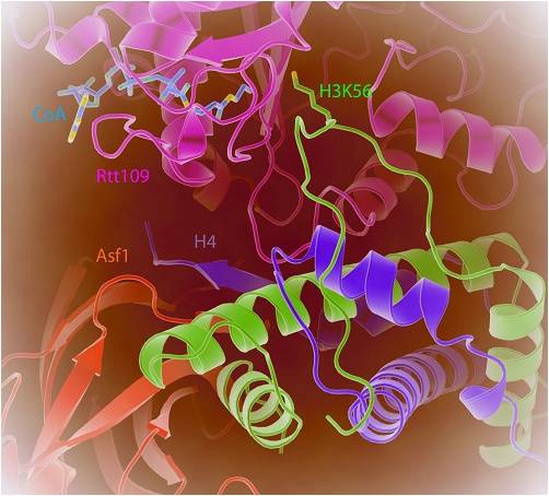 图:Rtt109-Asf1-H3-H4四元复合物和酰基供体乙酰辅酶A复合体的晶体结构