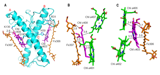 图4: FCP单体中的叶绿素c和岩藻黄素结合位点。A:对称分布的叶绿素c和岩藻黄素及其结合的氨基酸侧链。B和C:叶绿素簇与岩藻黄素分子的空间关系。