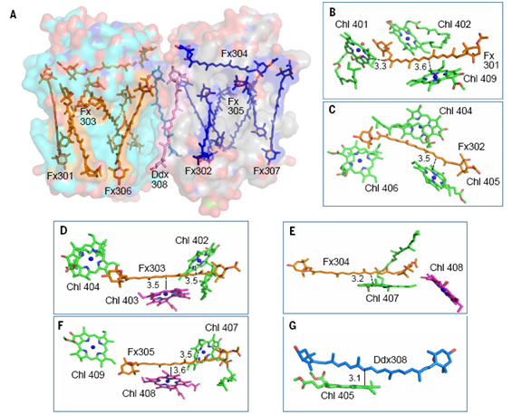 图5 岩藻黄素和硅甲藻黄素在FCP二聚体中的蛋白结合环境(A)以及与叶绿素之间的空间关系(B-G)。<center>