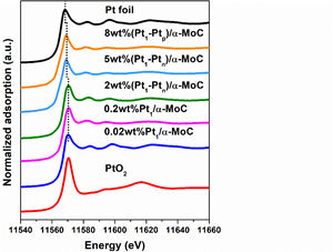 “氢能经济”被认为是实现社会可持续发展的关键进程之一。从水中产氢,以及氢气的输运和高效纯化是“氢能经济”发展的核心。其中,水煤气变换(water-gas-shift: WGS)反应与甲烷水蒸气重整反应的组合是目前工业制高纯氢气的主要关键技术之一。除此之外,氢燃料电池作为氢能的重要应用技术面临氢燃料中少量一氧化碳(CO)对燃料电池毒化的难题。因此,发展低温、高效、稳定的水煤气变换制氢催化剂,对上述工业产氢过程和氢能的大规模应用具有重要意义。该研究团队多年来致力于立方相碳化钼(α-MoC)负载高分散贵金属催化剂的催化产氢活性,也长期得到上海光源的支持,取得了一系列优异成果。此次报道的催化剂在近室温至400˚C的超宽温度区间实现高效水煤气变换制氢,突破了现有催化剂工作温度区间较高且窄的局限,并且大幅度提升了α-MoC负载的WGS催化剂的反应活性及长效稳定性。研究中XAFS、XRD实验分别在上海光源BL14W1、BL14B1线站完成:XAFS分析发现载量不高于2wt%时,Pt与α-MoC基底之间有更强烈的金属-载体相互作用,导致Pt与α-MoC之间的电荷转移使Pt带上部分正电荷,解释了该体系如何有效地防止α-MoC被深度氧化和催化剂失活;XRD表征显示,使用新的制备工艺,即使Pt负载量高达5wt%, Pt物种也均高度分散在α-MoC上,验证了Pt的高分散状态。