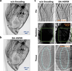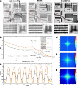 近期,团队又在HSFER技术中将深度学习辅助图像解码用于闪烁体荧光非相干成像过程,实现了完善的解码(DA-HSFER)。在DA-HSFER技术中,利用目标结构化深度神经网络(DNN),通过专门配置的数据集进行训练,成功地破译了x射线闪烁体荧光编码成像过程中的物理机制。同时,该方法保持了在不同样本之间的广泛适用性,不需要针对不同样本进行额外迁移学习,实现了闪烁体荧光的单次曝光高信噪比非相干编码成像过程。中高频图像信号的强度可以增加一个数量级或更多。使用DA-HSFER闪烁体成像探测器有望打破高分辨间接X 射线成像仪的性能瓶颈。相关研究以“DA-HSFER: Empowering High-Performance Incoherent X-ray Scintillation Encoded Imaging with Deep Neural Networks”为题,与补充封面一起发表于ACS Photonics杂志 (ACS Photonics, 2024, 3562)。上海高研院与上海应物所联合培养博士生石昊和王路为论文共同第一作者;吴衍青、谢红兰和邰仁忠为论文通讯作者。该系列工作得到国家自然科学基金项目、科技部重大研发项目,以及大科学中心研发项目的资助;同时得到上海光源BL08U、BL09B和BL13HB等线站的技术支持。