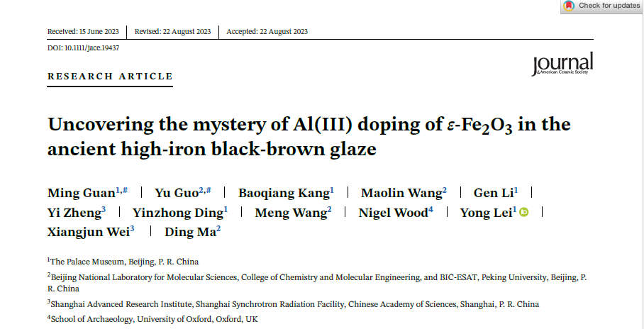 近日,故宫博物院雷勇博士、北京大学马丁教授、中国科学院上海高等研究院魏向军研究员和牛津大学伍德教授等多位学者联合署名发表了《Uncovering the mystery of Al(III) doping of in the ancient high-iron black-brown glaze》一文,解开了-Fe2O3晶体的合成之谜。这篇论文在线发表于陶瓷材料权威杂志《美国陶瓷学会会刊》(https://doi.org/10.1111/jace.19437)。