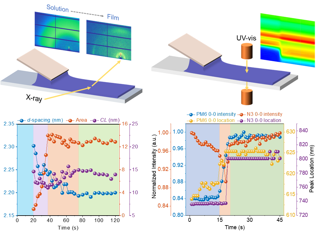 解决能源短缺和环境污染问题的一个理想策略就是开发和利用太阳能。有机太阳能电池(OSC)具有重量轻、溶液加工成本低、可印刷、可制备成柔性器件等优点而备受关注。目前,得益于非富勒烯受体的快速发展,OSC的最高光电转换效率(PCE)已突破19%。然而,这些高效率的OSC都是通过旋涂法制备的,很难推广应用到大面积太阳能电池的制备。相对于旋涂,刮刀涂布是卷对卷印刷工艺的原型工具,可以实现有机太阳能电池的大面积制备。但是,由于OSC体相异质结形貌的形成,是一个秒级时间尺度下的动态演变的过程。伴随着刮涂液相成膜,溶剂的挥发将诱导给/受体相分离、成核、结晶以及分子构象改变等,最终形成复杂的多尺度微观结构。由于对刮涂过程中溶液剪切效应缺乏深入了解,刮涂器件的PCE滞后于旋涂器件。因此,迫切需要采用多方法结合技术,原位实时研究OSC形貌动态演变过程和成膜机制。