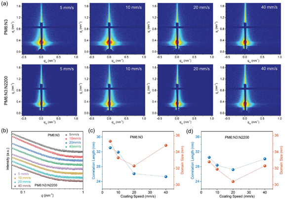 GISAXS研究发现,随着刮速的增加,二元共混薄膜(PM6:N3)的供体相干长度逐渐减小,三元共混薄膜(PM6:N3:N2200)的供体相干长度则是先减小后增大,在中等涂层速度(20 mm/s)下达到一个最小值。而无论二元和还是三元体系,随着刮速的增加,受体相区尺寸都是先减小后增大。此外,三元体系的受体相区尺寸比二元体系的小,说明第三元组分N2200的引入可以减小受体相区尺寸。这些结果表明,溶液剪切速度是影响活性层相分离的重要因素之一,而第三元组分的添加也将有利于具有适当尺寸微相区的形成,这将有助于激子的扩散和解离。原位GIWAXS研究得到了OSC剪切液相成膜过程中层状结晶的晶面间距、峰面积和相干长度随时间的演化规律,由此可将成膜过程分为 (I)溶解状态,(II)成核和生长,(III)溶剂膨胀状态和(IV)玻璃态这四个阶段。在中等涂层速度下,二元和三元体系成膜过程中的第二和第三阶段相对较长,这将有利于晶体微观结构的改善和结晶度增加。与二元共混薄膜相比,三元共混体系相关长度的增加过程更长,溶剂膨胀的有序聚集体初始尺寸更小,更有利于提高分子有序堆积和微晶的完善。原位UV-vis吸收光谱时间分辨测量,通过分析供体和受体吸收峰强度和位置随时间的演变,研究了供体(PM6)和受体(N3)的动态聚集。结果发现,无论是二元体系还是三元体系在中等刮速下从溶液到薄膜的转变阶段要比其他刮速所需的时间更长,聚合物和小分子将有足够的时间用来聚集和结晶,对优化微晶结构、提高结晶度有一定的帮助。这也解释了为什么在中等刮涂剪切速率下OSC表现出了最高的结晶度和更为有序的分子排列。更为重要的是,光电转换性能测试结果表明,随着刮速的增加,PCE先升高后降低,中等刮速下器件表现出最佳的光伏特性。因此,形貌-演变-性能间的构效关系以及溶液剪切机制通过该原位实时测量研究得以阐明。