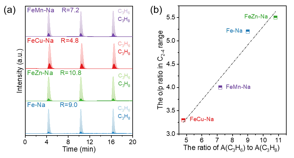 图2. (a)丙烯脉冲和(b)C2-4烃类烯烷比与R值关系