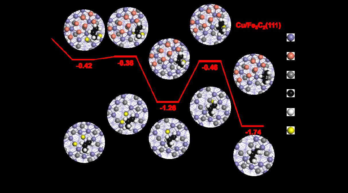 图3. 丙烯在Fe5C2(111)和Cu/Fe5C2(111)表面氢化成丙烷的反应途径