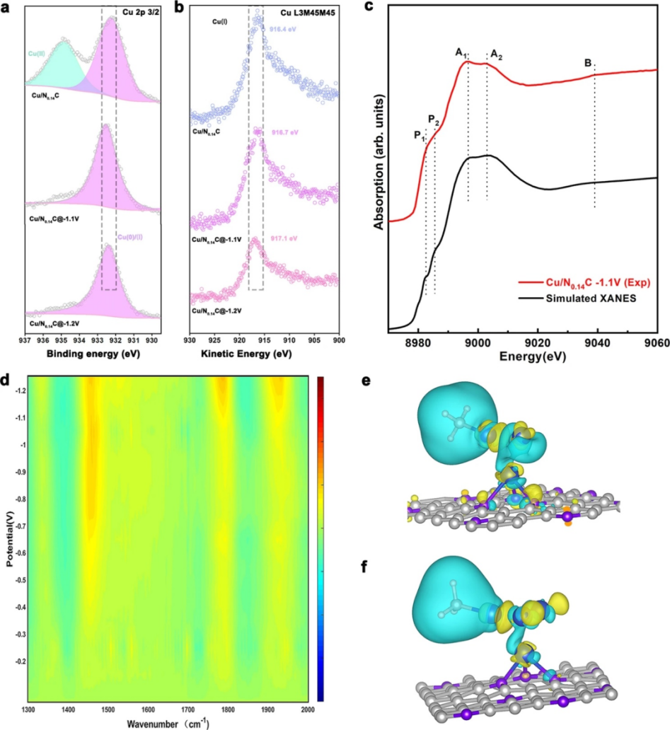 多维度原位(Operando)谱学表征技术对全面深入认识电催化反应机理具有重要意义,其中原位XAFS方法可以获取工况条件下催化位点金属离子局域结构和电子结构,光电子能谱方法(XPS和AES)可以探测催化剂表面电子结构,红外光谱方法(FTIR)可以得到表面反应中间基团信息。研究团队综合三种原位谱学表征方法的优势,从空间局域结构、表面电子结构和表面反应中间基团三个维度揭示工况条件下催化剂Cu/N0.14C活性位点自发重构过程,进而阐释CO2RR活性和选择性的构效关系。基于上海光源BL14W1线站, Operando XAFS结果证实在工况条件下催化剂从分散的CuO团簇原位自发重构生成Cu-Cu低配位数的真实活性物种,这是一个可逆的电位依赖转变过程。而XPS和AES结果证明催化活性物种不存在0价金属Cu,可以排除大尺寸铜颗粒的存在。为了进一步获得活性位点的三维空间结构,研究团队发展基于多金属位点的多重散射理论从头计算方法精确解析Operando XANES,得到真实活性物种的三维空间精细结构为锚定在氮掺杂碳上的Cu2-CuN3团簇,其可以通过调节Cu原子和氮掺杂碳界面之间的电荷分布保持Cu团簇优异的稳定性和高活性。结合 Operando FTIR和DFT理论计算,发现Cu2-CuN3团簇表现出电荷不对称的特点,CH3* 吸附增强这种效应,有利于不对称产物乙醇的生成。