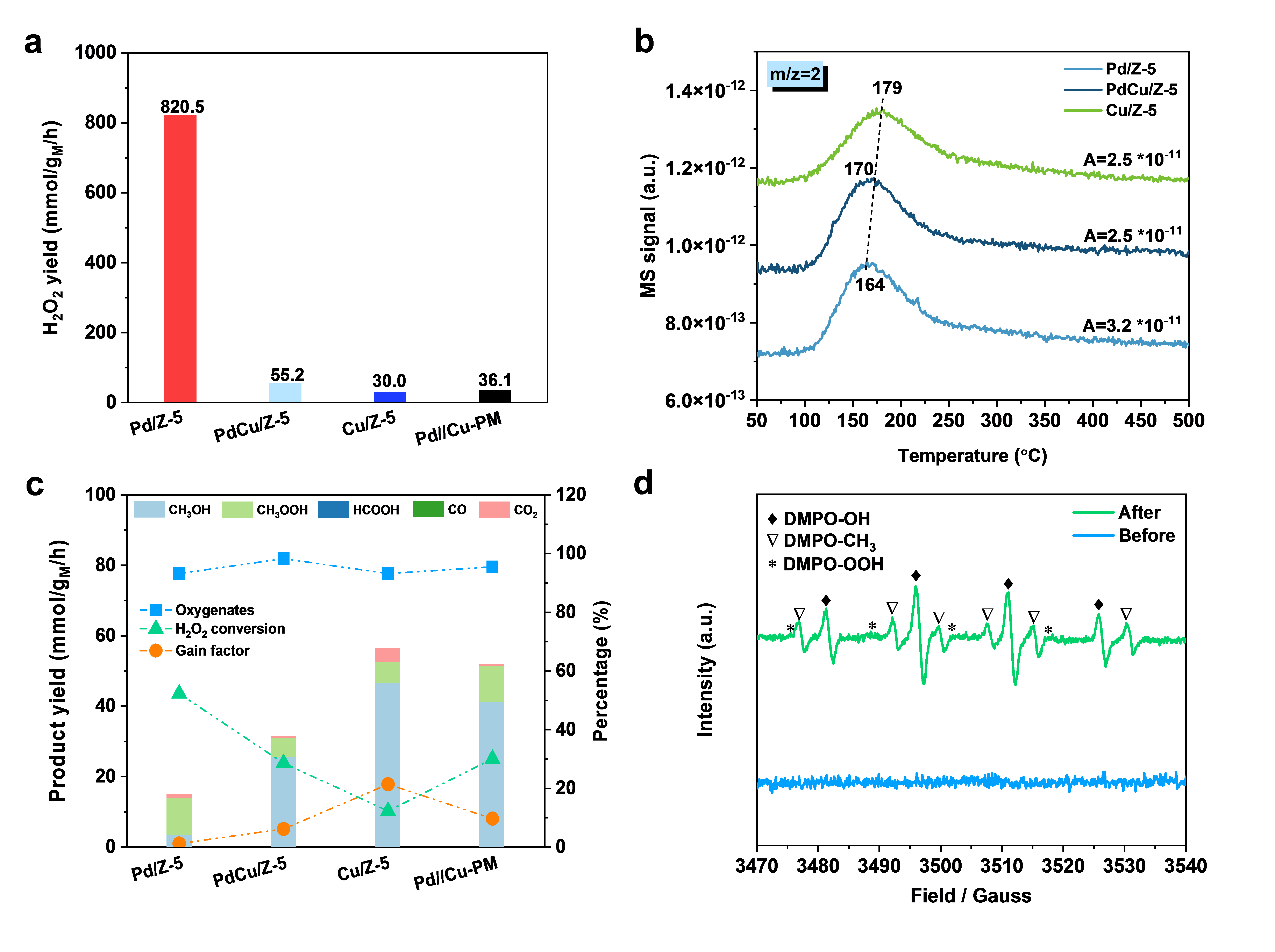 近日,中科院上海高等研究院低碳转化科学与工程重点实验室钟良枢研究员、孙予罕研究员团队在国际顶级期刊Angew. Chem. Int. Ed.上发表了题为“Tandem Catalysis for Selective Oxidation of Methane to Oxygenates Using Oxygen over PdCu/Zeolite”的研究论文(Angew. Chem. Int. Ed.,2022,DOI: https://doi.org/10.1002/anie.202204116)。该研究构建了一种ZSM-5(Z-5)负载的PdO纳米颗粒和Cu单原子共存的双组分体系(PdCu/Z-5),实现了以分子氧(O2)为氧化剂,在H2存在条件下串联催化甲烷(CH4)转化为含氧产物,在120 °C下获得了高达1178 mmol/gPd/h的含氧产物收率和95%的含氧产物选择性。通过串联催化途径,在PdCu/Z-5催化剂上实现了以O2为氧化剂CH4高效转化制备含氧产物,并结合控制实验和机理研究阐明了Pd和Cu物种在反应过程中起的作用。
