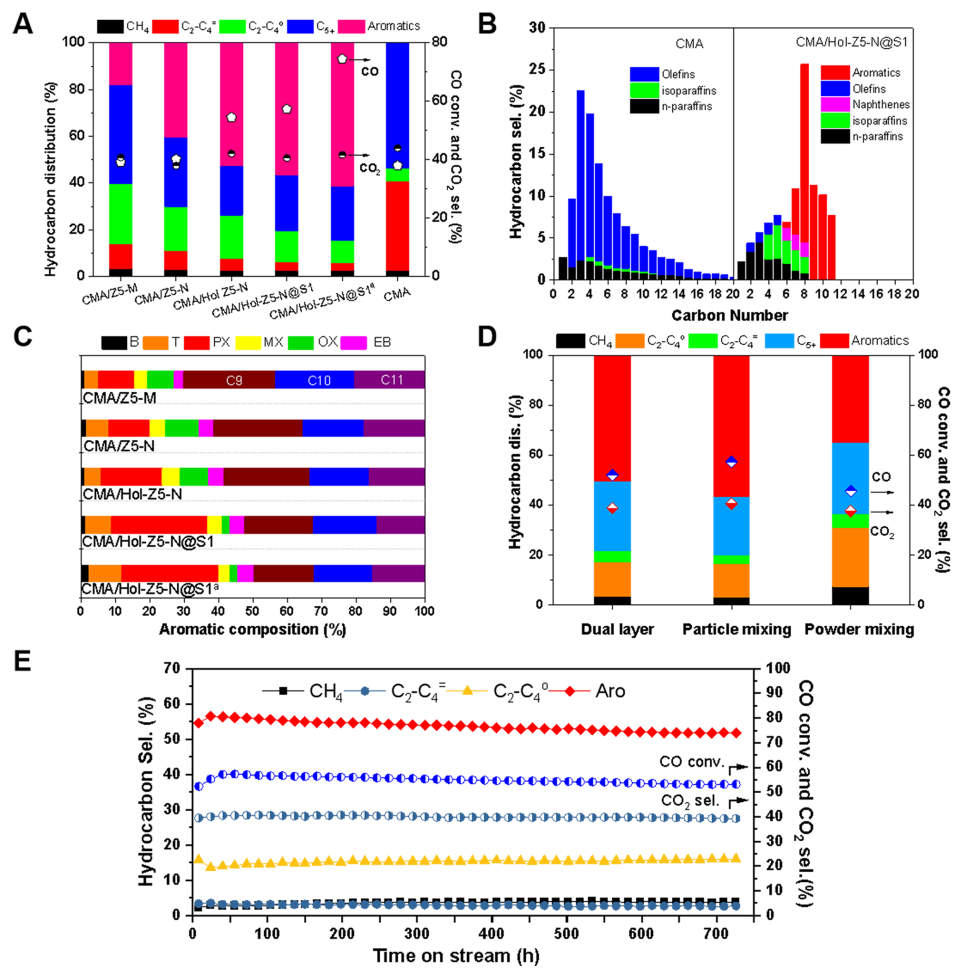 本文构建了鳞片状Silicalite-1(S1)包裹的纳米中空ZSM-5分子筛并与CoMnAl氧化物耦合,双功能催化剂在温和反应条件下,同时展现了高CO转化率、高芳烃选择性与高稳定性,并获得了前所未有的PX时空产率。通过在纳米中空ZSM-5表面外延生长与之具有相同拓扑结构的鳞片状Silicalite-1分子筛,在不影响传质的条件下有效地钝化了外表面酸性,促进了PX的选择性生成。在280 oC、2 MPa和1000 mL g-1 h-1的温和反应条件下,CO转化率70.7%,烃类产物中芳烃选择性大于63.5%,CH4选择性为2.9%,芳烃中PX的比例高达34.7%,综合性能著优于此前报道的催化体系。而且,该催化剂的活性和选择性能够维持700小时以上而未见衰减,展现出了优异的工业应用潜力。
