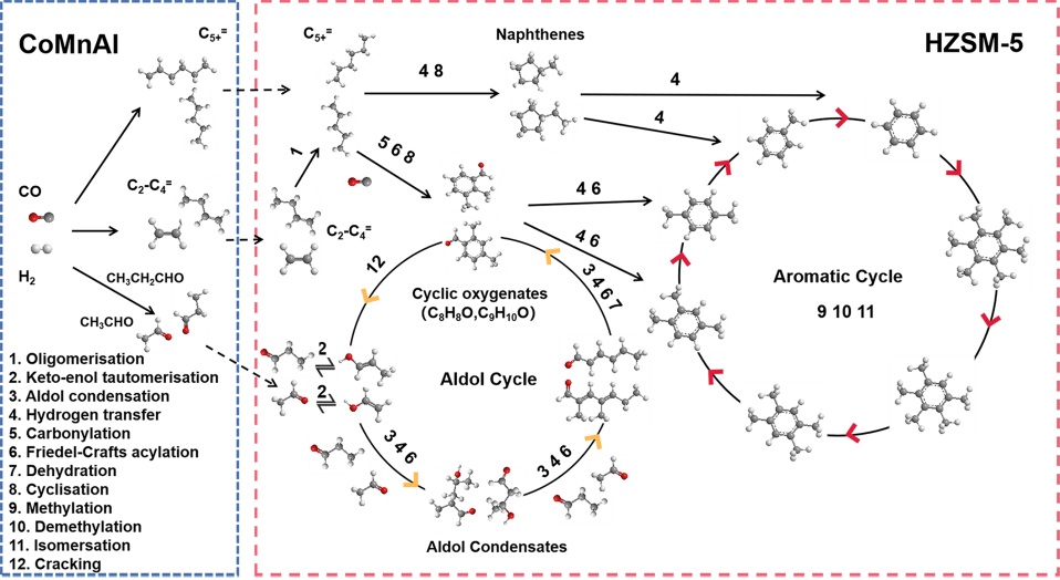 非石油基碳资源(煤炭、生物质、天然气、二氧化碳、固体废弃物等)经合成气(CO+H2)转化制备大宗化学品可以有效缓解我国日益严重的石油短缺状况,提升国家能源安全,是实现能源生产和消费革命的主要途径,是煤炭行业去产能供给侧改革的重要手段。芳烃作为最重要的大宗化学品之一,特别是对二甲苯(PX),其下游产品广泛地应用在航空航天、国防科技等重要领域。基于耦合催化剂,合成气制芳烃现有两条反应路径:一是甲醇合成催化剂与分子筛耦合经过甲醇中间体制取芳烃(SMA);二是将铁基费托合成制烯烃(FTO)催化剂与分子筛耦合经过烯烃中间体制取芳烃(SOA)。现有报道的两类耦合催化体系反应条件较为苛刻(320~430oC),且催化剂活性、选择性与稳定性三者难以匹配。