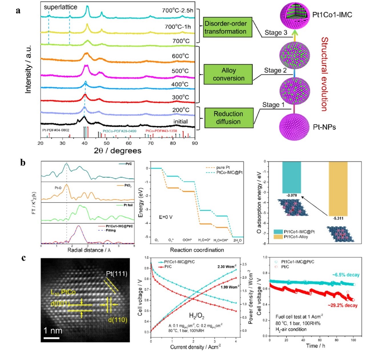 发展氢能燃料电池(PEMFC)符合国家能源战略,有助于实现“碳达标、碳中和”发展目标。目前,由于阴极侧高Pt用量大幅增加了PEMFC成本,严重制约其规模化应用。同时,高金属担载量Pt基催化剂才能满足实用化需求,但高金属载量势必会增加粒径控制的难度,尤其对于Pt合金催化剂。鉴于此,中科院上海高研院杨辉团队联合上海光源姜政团队在氢燃料电池研究领域进行交叉融合并取得重要研究进展,率先发展了一种氧化钴辅助超小Pt纳米晶可控结构演化策略,开发出高金属担载量(44.7 wt%)、小尺寸(sub-6 nm)、核壳结构的有序PtCo金属间化合物氧还原催化剂(Pt1Co1-IMC@Pt/C),同步辐射吸收光谱结合DFT理论计算揭示了活性、稳定性增强起源,并在燃料电池中实现性能高效表达,获得高功率密度和优异的稳定性,能够满足未来对实用化低Pt催化剂发展需求。研究成果以“High-loaded sub-6 nm Pt1Co1 intermetallic compounds with highly efficient performance expression in PEMFCs”为题在线发表在Energy Environ. Sci.,2022,doi.org/10.1039/D1EE02530A,论文第一作者是上海高研院程庆庆博士,杨辉研究员和邹亮亮副研究员为通讯联系人。