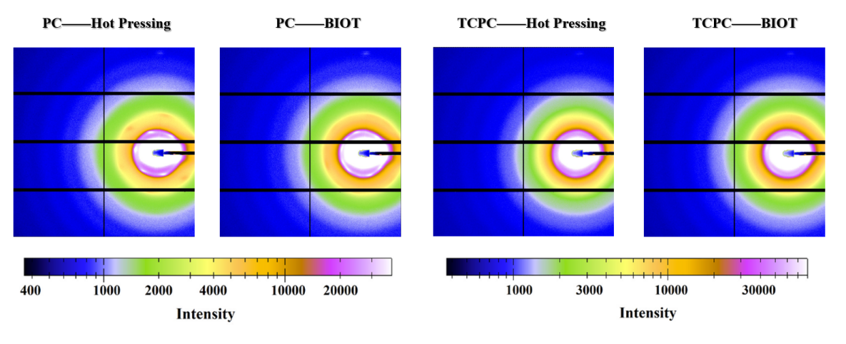 图2. 经热压和BIOT加工后PC和TCPC薄膜的二维USAXS散射图案。