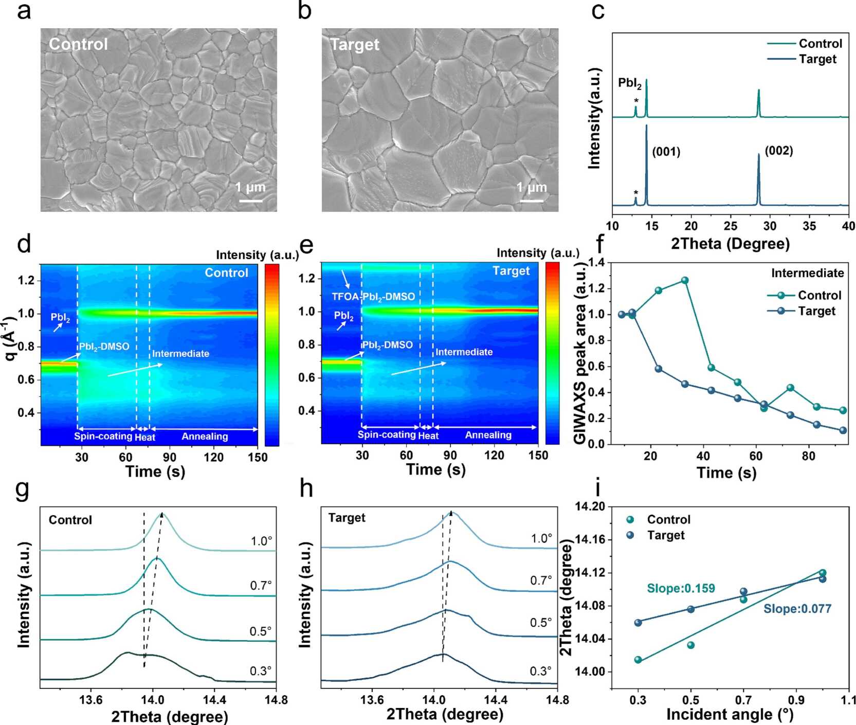 图 (a-b)对照与目标钙钛矿薄膜的SEM图像;(c)XRD图谱;(d-e)钙钛矿的原位GIWAXS图谱;