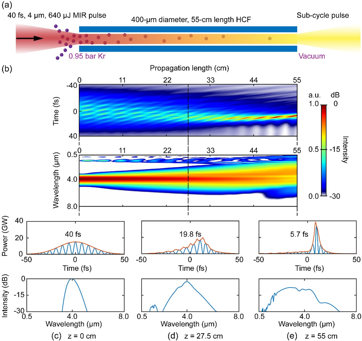 气压梯度HCF的核心优势在于,通过精确选择气体介质和优化气压梯度,可实现非线性与色散特性的灵活调控。基于孤子自压缩效应,激光脉冲在波导反常色散与自相位调制的协同作用下可实现高效压缩。模拟结果表明,采用气压梯度HCF可以将中心波长4μm、脉冲能量640μJ、脉冲长度40 fs的输入脉冲压缩至5.7fs(约0.4个光周期),压缩效果详见图2。