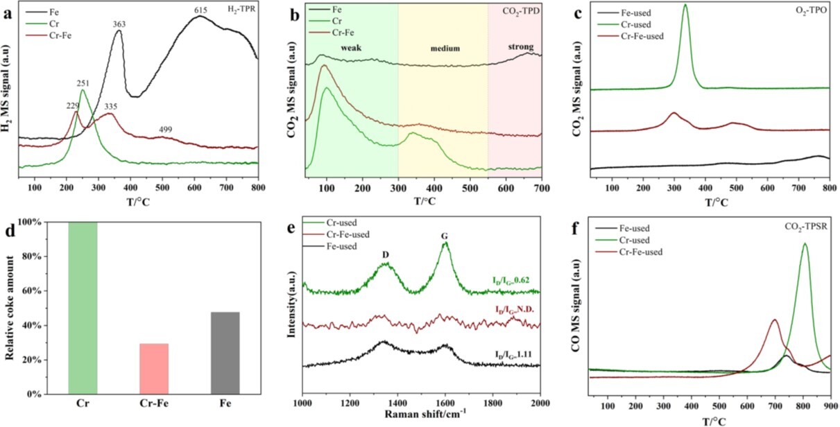图2. FeCrOx催化剂样品的 (a) H₂-TPR和 (b) CO₂-TPD图谱,反应后样品的 (c) O2-TPO, (e) Raman, 和 (f) CO2-TPSR,以及 (d) 根据 (c) 图估算的催化剂相对积碳量。